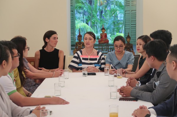 Tổng Lãnh sự Pháp Emmanuelle Pavillon-Grosser (ở giữa) trao đổi với các cựu du học sinh có ảnh được chọn triển lãm |