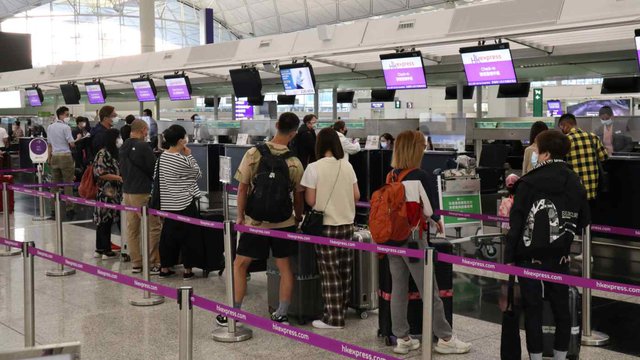 Dòng người xếp hàng tại sân bay Hongkong International để làm thủ tục lên chuyến bay của hãng HK Express tới Fukuoka. Ảnh: Nikkei Asia.
