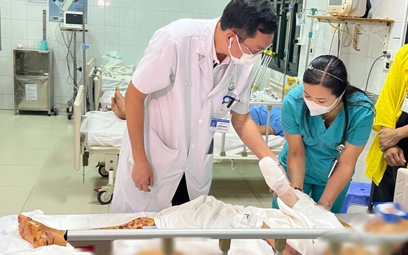 Vào 2h30 ngày 6/8, Bệnh viện Hữu nghị Việt Đức tiếp nhận trường hợp bệnh nhân T.T.C (37 tuổi, Bắc Giang) trong tình trạng đa chấn thương, chấn thương biến dạng hàm mặt, vỡ nhãn cầu mắt phải, vết thương ngang khí quản do có mảnh nhựa cắm sâu. Cùng với đó là rất nhiều vết thương ngực, bụng, hai bên đùi; cụt chấn thương dập nát toàn bộ ngón 2-5 bàn tay phải.