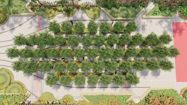 Tại vị trí trung tâm cùng hai cổng chào tạo thành hình tam giác là hình ảnh tán rừng “Cây cao bóng cả” do 51 cây lộc vừng cao 3 – 4m, được bố trí thành 5 dãy theo hình dích dắc.