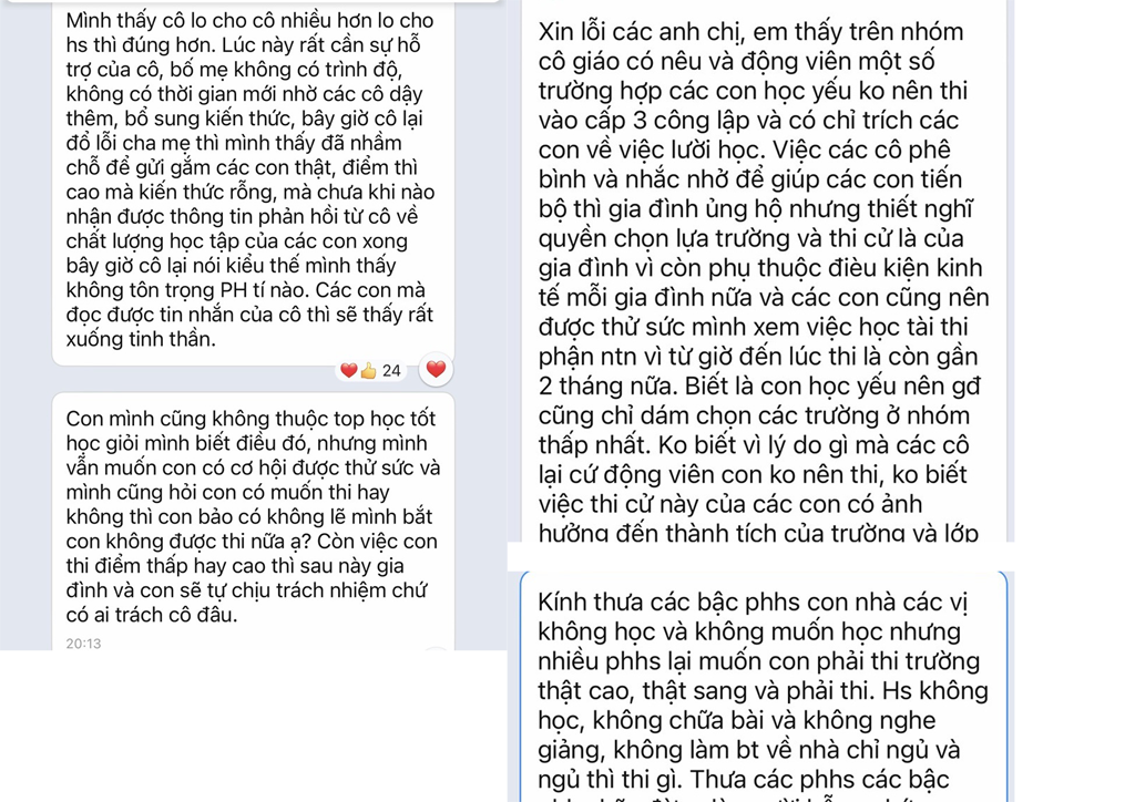 Phụ huynh không dám phản ứng nhưng trong nhóm không có GV thì cách nói của cô khiến nhiều ý kiến phản ứng gay gắt. Một phụ huynh viết: “Cô giáo nêu tên và động viên một số trường hợp các con học yếu không nên thi vào cấp 3 công lập và chỉ trích các con về việc lười học. Việc các cô phê bình và nhắc nhở để giúp các con tiến bộ thì gia đình ủng hộ nhưng thiết nghĩ quyền chọn lựa trường và thi cử là của gia đình vì còn phụ thuộc điều kiện kinh tế của mỗi gia đình. Biết là các con học yếu nên gia đình cũng chỉ dám chọn các trường ở nhóm thấp nhất. Không biết vì lý do gì mà các cô lại cứ động viên con không nên thi, không biết việc thi cử này của các con có ảnh hưởng đến thành tích của trường và lớp không?”.