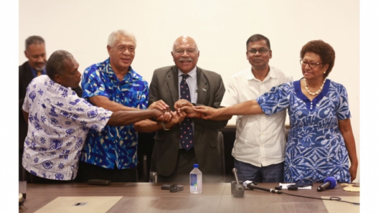 Ông Sitiveni Rabuka (giữa) chụp ảnh cùng đại diện đảng Liên bang Quốc gia và đảng Dân Chủ Tự do xã hội tại lễ ký thành lập chính phủ liên minh. (Ảnh: Đảng Liên bang Quốc gia).Ngay sau khi kết quả được công bố, cả đảng Fiji First và liên minh giữa đảng Liên minh Nhân dân và đảng Liên bang Quốc gia đều cùng lúc tiến hành đàm phán nước rút với đảng Dân chủ Tự do Xã hội. Đảng Dân chủ Tự do Xã hội đã tiến hành bỏ phiếu và kết quả cuối cùng cho thấy đa số phiếu ủng hộ việc tham gia chính phủ liên minh giữa đảng Liên minh Nhân dân và đảng Liên bang Quốc gia.