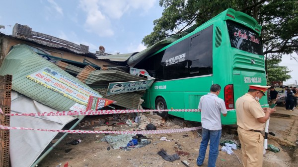 Hậu quả, xe khách tông sập mái hiên, tường nhà dân. Phần đầu, hông của xe khách biến dạng. 2 người trên xe khách tử vong tại chỗ gồm tài xế và 1 hành khách, 5 người khác trên xe khách bị thương được đưa đi cấp cứu.
