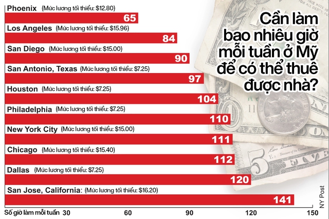 Riêng ở thành phố New York, những người hưởng lương tối thiểu sẽ cần phải làm việc 111 giờ/tuần để đủ tiền thuê một căn hộ 1 phòng ngủ.
