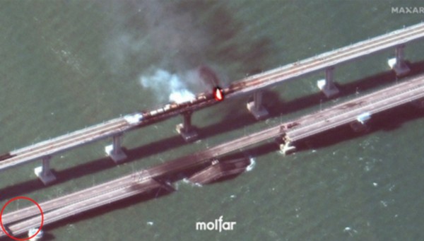 Cây cầu Crimea bị hư hại sau khi bị đánh bom. Ảnh: Maxar, Molfar.Tuy nhiên, một bài báo mới đây đã có cách tiếp cận khác và nhận định, vụ nổ trên cây cầu Crimea chiến lược có thể được gây ra bởi một thiết bị không người lái do Mỹ cung cấp cho quân đội Ukraine. Thiết bị này có thể là máy bay không người lái (UAV) hoặc thuyền không người lái (UUV).