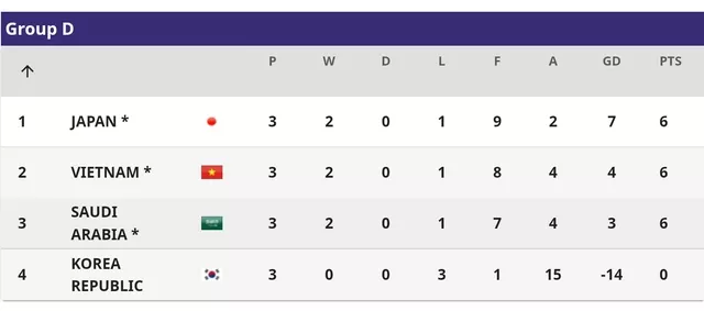 Việt Nam, Nhật Bản giành vé đi tiếp tại bảng D. Trong khi đó Saudi Arabia cũng có được 6 điểm nhưng bị loại vì thành tích đối đầu kém hơn.