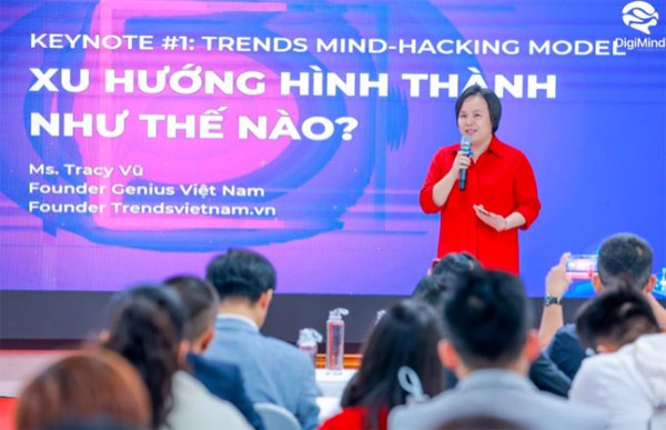 Bà Tracy Vũ, Giám đốc chiến lược DigiMind Group, nhà sáng lập mô hình Trends Mind-Hacking Model chia sẻ tại sự kiện Trends Summit #01: “Định nghĩa lại tương lai”.