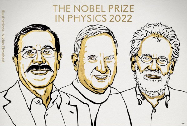 Giải Nobel Vật lý 2022 tôn vinh các nhà khoa học vì “những thí nghiệm với vướng mắc lượng tử, thiết lập sự vi phạm các bất đẳng thức Bell và tiên phong khoa học thông tin lượng tử”.