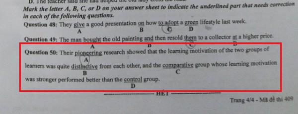 Ngoài ra, câu mà đề thi trích dẫn để hỏi thí sinh còn có lỗi về dấu câu trong câu. Viết đúng nguyên tắc của mệnh đề tính từ trong tiếng Anh phải là: “Their pioneering research showed that the learning motivation of the two groups of learners was quite distinctive from each other, and the comparative group, whose learning motivation was stronger, performed better than the control group”.