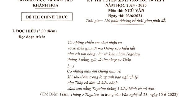 Sau đây là gợi ý giải đề thi môn ngữ văn kỳ thi tuyển sinh vào lớp 10 năm 2024-2025 của tỉnh Khánh Hòa do nhóm giáo viên Trường THCS Âu Cơ, TP.Nha Trang thực hiện.
