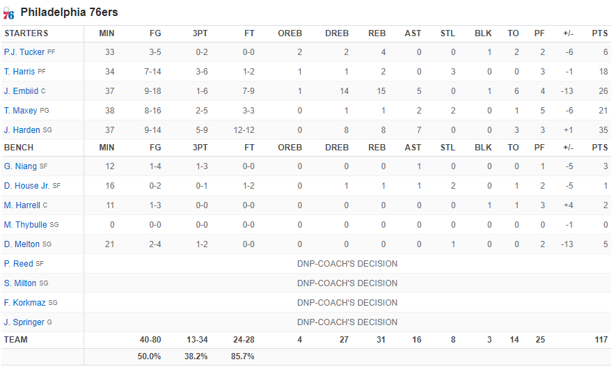 Ở bên phía Philadelphia 76ers, James Harden ghi 35 điểm, 8 rebounds, 7 kiến tạo. Joel Embiid có 26 điểm, 15 rebounds. Tyrese Maxey đóng góp 21 điểm và Tobias Harris cũng mang về 18 điểm. Thế nhưng, họ chỉ có đúng 11 điểm đến từ băng ghế dự bị, khiến Philadelphia 76ers bị hụt hơi ở hiệp 3 và đánh rơi chiến thắng.