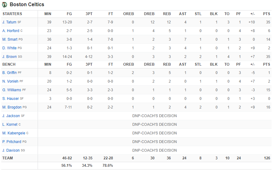 Trong chiến thắng của Boston Celtics, bộ đôi Jayson Tatum và Jaylen Brown chiếm hoàn toàn ánh hào quang, khi đóng góp 70 điểm chia đều cho mỗi cầu thủ. Malcolm Brogdon, Grant Williams và Marcus Smart lần lượt có 16 điểm, 15 điểm và 14 điểm.