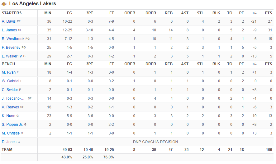Sự tỏa sáng của Anthony Davis, kết hợp với những tình huống thi đấu khá tốt của Russell Westbrook đã giúp Los Angeles Lakers có một thế trận cân bằng với đội chủ nhà ở hiệp 1 và 2. LeBron James có một này thi đấu chưa thật sự xuất sắc, thế nhưng Los Angeles Lakers cũng phần nào thành công trong việc hạn chế sự nguy hiểm của Stephen Curry trong 24 phút thi đấu đầu tiên.