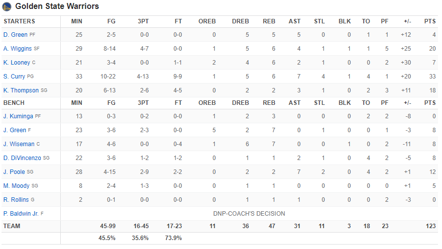 Với sự dẫn đầu của LeBron James, Los Angeles Lakers đã có sự trở lại mạnh mẽ ở hiệp 4. Họ rút ngắn khoảng cách xuống chỉ còn 12 điểm. Thế nhưng, những cú ném 3 điểm liên tiếp của Stephen Curry và Andrew Wiggins đã giúp Golden State Warriors tái lập thế trận. Đội chủ sân CHASE Center kết thúc trận đấu với chiến thắng 123-109, một kết quả hoàn hảo trong ngày nhận về nhẫn vô địch.