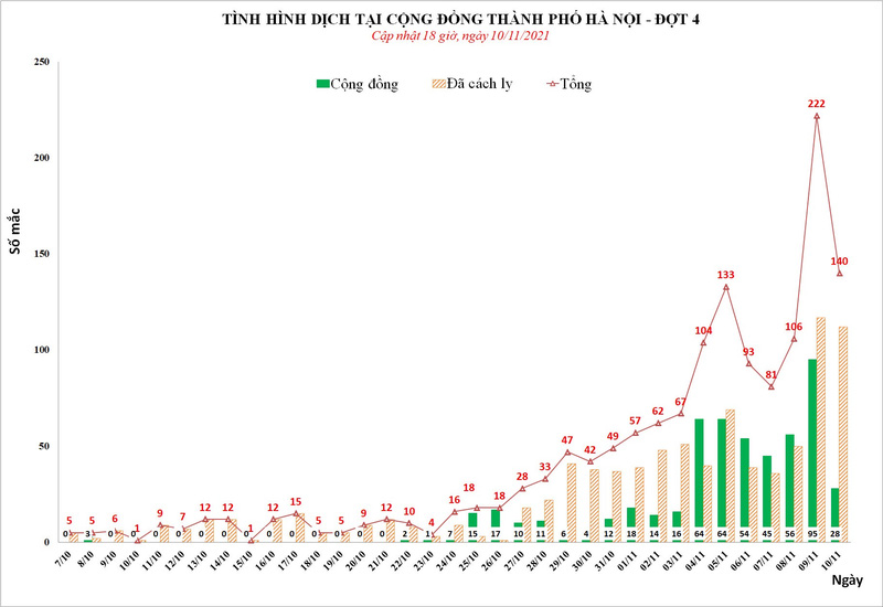 Theo thống kê của Sở Y tế Hà Nội, ngày 10/11, trên địa bàn thành phố ghi nhận 140 ca dương tính mới, trong đó có 28 ca tại cộng đồng.