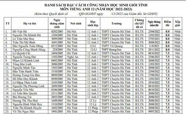 Ngày 14.12, thông tin từ Sở GD-ĐT tỉnh Hà Tĩnh cho biết, đơn vị này vừa ban hành quyết định về việc đặc cách công nhận học sinh giỏi tỉnh môn tiếng Anh lớp 12 (năm học 2022-2023) cho 91 em học sinh mà không phải dự thi, do các em này đạt điểm IELTS từ 7.0 trở lên.