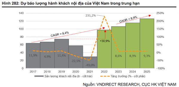 Trong giai đoạn 2017-2019, lượng hành khách nội địa đã tăng trưởng kép 9,4%, có thể coi đây là mức tăng trưởng tự nhiên của lượng hành khách nội địa, đến từ tăng trưởng thu nhập và yếu tố về nhân khẩu học của Việt Nam. Tuy nhiên, sự xuất hiện của dịch Covid-19 đã làm tê liệt ngành hàng không Việt Nam, tăng trưởng bị gián đoạn và ngành bước vào giai đoạn khó khăn trong 2020-2021. Kể từ quý 2/2022, việc bao phủ vắc xin trên toàn quốc đã giúp Việt Nam kiểm soát đại dịch và ngành hàng không trong nước bắt đầu phục hồi, ghi nhận mức tăng trưởng ấn tượng. Tiếp nối đà tăng trưởng trong 9 tháng 2022, chuyên gia VNDirect kỳ vọng lượng khách nội địa năm 2022 sẽ tăng 231,2% so với cùng kỳ và tăng 30,9% so với năm 2019, duy trì mức tăng trưởng kép 9,4% trong giai đoạn 2017-2022.