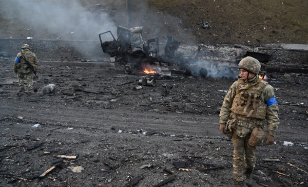 Các binh sĩ Ukraine tìm kiếm những quả đạn chưa nổ sau cuộc giao tranh với nhóm đột kích Nga ở thủ đô Kiev của Ukraine ngày 26.2