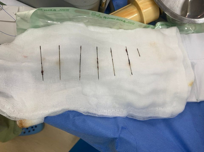 Sau gần 3 giờ phẫu thuật, bằng phương pháp mở ngực, các bác sĩ đã lấy 7 cây kim ra khỏi lồng ngực bệnh nhân, trong đó 1 cây đâm vào nhĩ trái, 3 cây đâm vào quai động mạch chủ, 1 cây đâm thủng thùy trên phổi trái, 1 cây trong khoang màng phổi trái, 1 cây trong cơ thành ngực (bị gãy đôi).