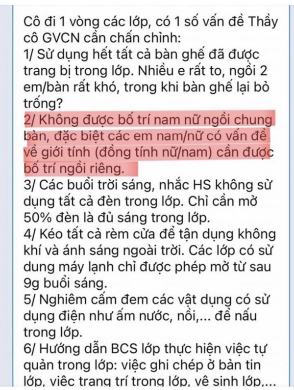 Cũng trong tin nhắn gửi giáo viên chủ nhiệm các lớp, nữ hiệu trưởng lưu ý: “Không bố trí nam, nữ ngồi chung bàn, đặc biệt các em có vấn đề giới tính (đồng tính nữ/nam) cần được bố trí ngồi riêng”.