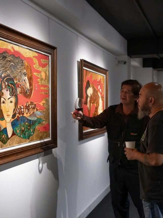 Họa sĩ Văn Y giới thiệu bức tranh sơn mài Ngựa hoang (khổ 80 x 120 cm) với người thưởng lãm ẢNH: NVCC