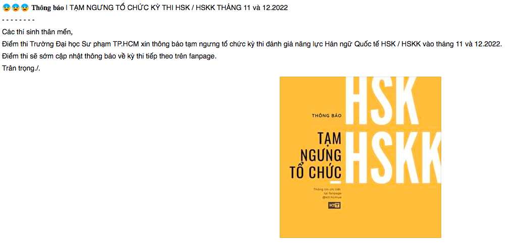 Trao đổi với PV Thanh Niên sáng 10.11, thạc sĩ Nguyễn Ngọc Trung, Phó hiệu trưởng Trường ĐH Sư phạm TP.HCM, cho biết từ ngày 28.10 trường đã có thông báo tạm ngưng tổ chức kỳ thi đánh giá năng lực Hán ngữ quốc tế HSK, HSKK (theo lịch thi dự kiến tháng 11 và 12 năm nay). Thông báo từ tháng 10 của trường này cho biết “điểm thi sẽ cập nhật thông báo về kỳ thi tiếp theo trên fanpage”.