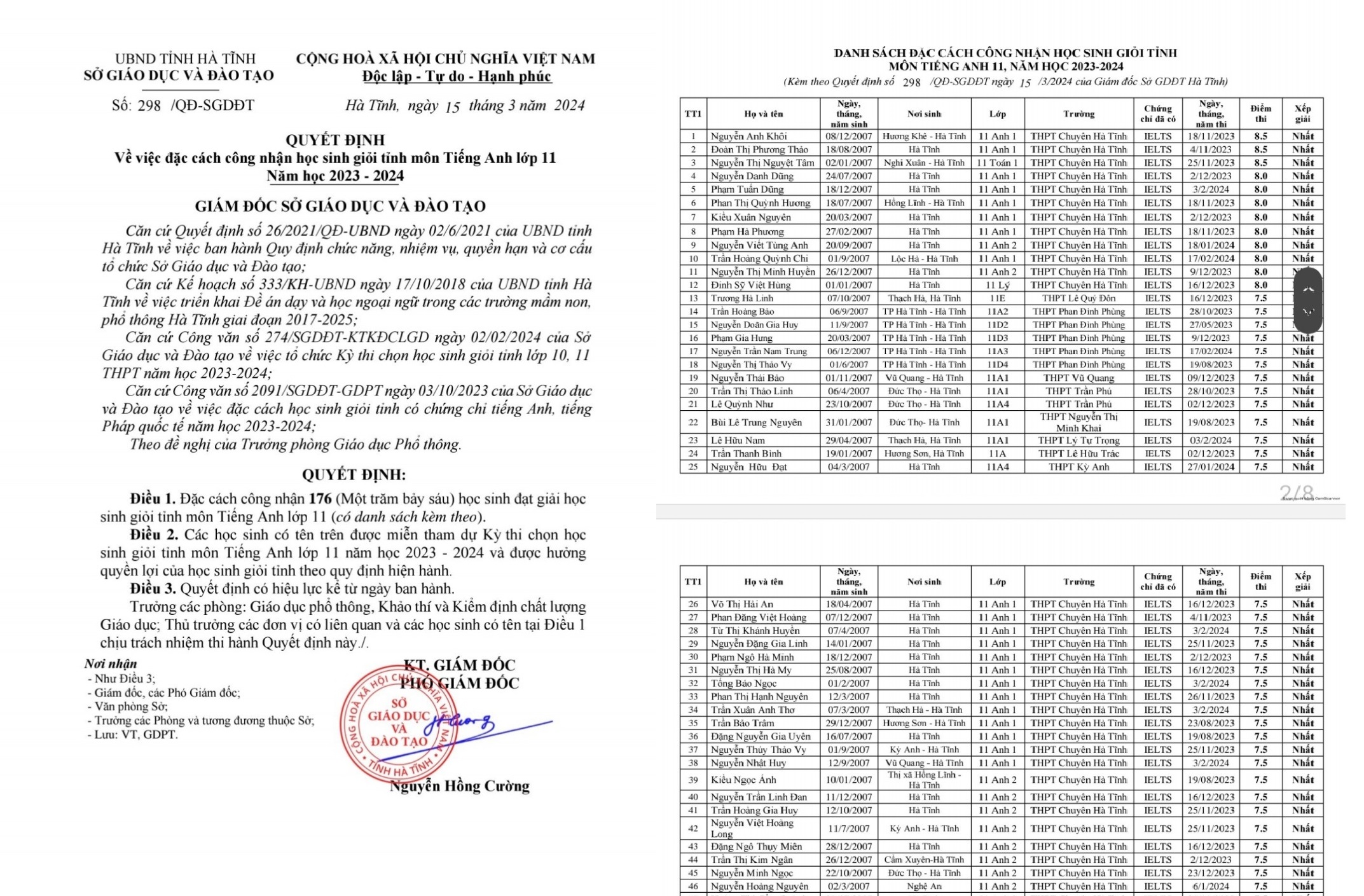 Trước đó, ngày 28.2, Sở GD-ĐT tỉnh Hà Tĩnh cũng ra quyết định công nhận 47 học sinh lớp 10 đạt IELTS từ 6.0 trở lên là học sinh giỏi cấp tỉnh môn tiếng Anh mà không phải tham dự kỳ thi cùng tên.
