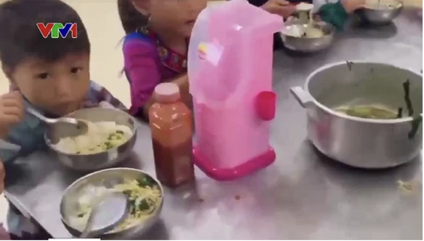 Theo phóng sự của VTV, cứ 2 gói mì nấu lên làm canh, chan lõng bõng với cơm là bữa ăn bán trú của 11 em học sinh