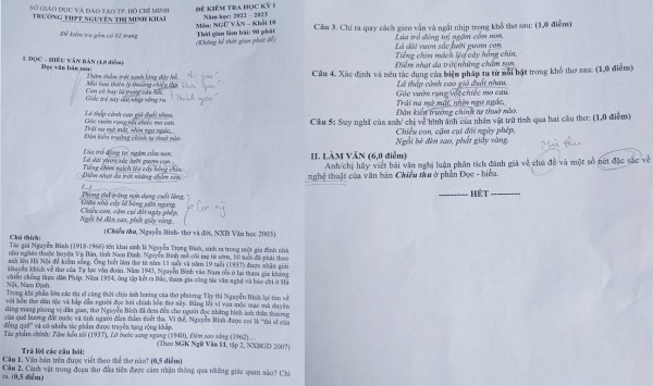Chẳng hạn, đề kiểm tra của Trường THPT Nguyễn Thị Minh Khai có 2 phần: đọc hiểu và viết. Tại phần đọc hiểu văn bản, học sinh sẽ tìm hiểu bài thơ Chiều Thu của nhà thơ Nguyễn Bỉnh Khiêm (không nằm trong sách giáo khoa lớp 10), phần viết có nội dung phân tích chính đoạn thơ trong phần đọc hiểu văn bản và không có phần nghị luận xã hội.