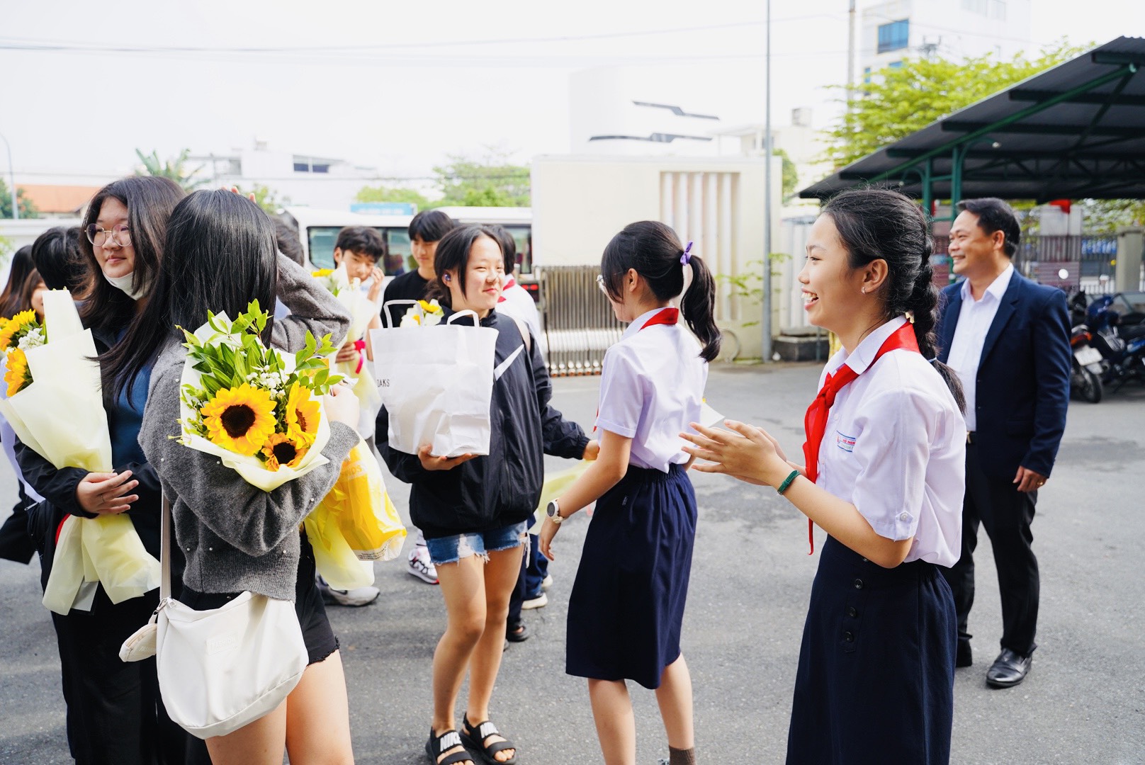 Lãnh đạo trường học, các thầy cô, học sinh Q.Hải Châu chào đón đoàn học sinh Hàn Quốc