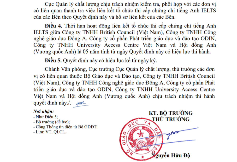 Thời hạn hoạt động liên kết tổ chức thi cấp chứng chỉ tiếng Anh IELTS giữa các công ty Việt Nam nói trên với Hội đồng Anh (Vương quốc Anh) là 5 năm tính từ ngày quyết định này có hiệu lực thi hành.