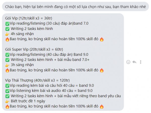 Song song đó, Y.I cũng giới thiệu dịch vụ “IELTS VIP” có gói VIP 1 giá 81 triệu đồng cho 3 kỹ năng đọc, nghe và viết. Người này cho biết chỉ bán trọn gói, không mua lẻ, trật kỹ năng nào sẽ hoàn 27 triệu đồng và nếu muốn, có thể giao dịch trực tiếp ở địa chỉ cụ thể tại TP.Hải Phòng. Theo quảng cáo, đây là đề từ “nội bộ hội đồng thi”. “Bên mình sẽ ký hợp đồng và cho bạn xem feedback (phản hồi) của TS bộ vip”, Y.I thông tin.