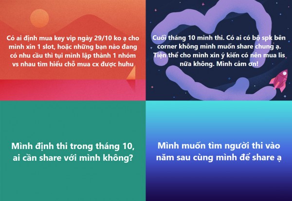 Bên cạnh những bài viết kêu gọi công khai, có không ít TS đăng tin ẩn danh, chỉ đề cập đến ngày thi cụ thể để tìm “đồng đội”, sau đó trao đổi thêm ở tin nhắn riêng. Liên hệ với một số TS đăng tin, chúng tôi được báo giá dao động từ hàng chục nghìn nếu mua chung đề “dự đoán”, đến hàng triệu đồng nếu chọn đề “VIP”, với đa dạng nguồn cung khác nhau.