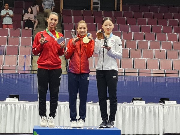 Dương Thúy Vi (giữa) trên bục nhận huy chương |