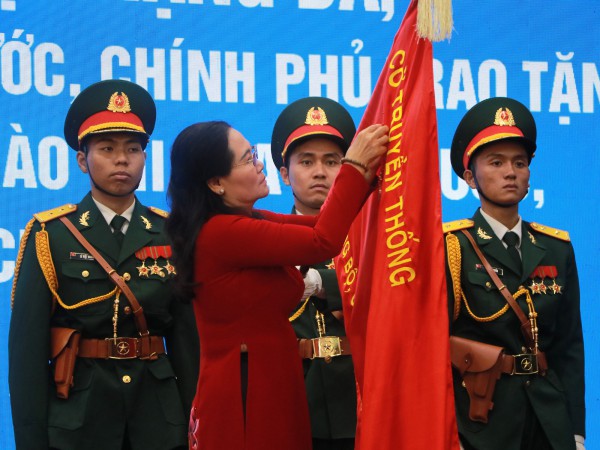 Bà Nguyễn Thị Lệ, Phó bí thư Thành ủy, Chủ tịch HĐND TP.HCM, gắn Huân chương Độc lập hạng ba lên lá cờ truyền thống của H.Củ Chi