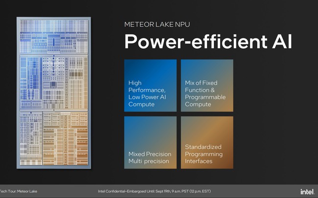 Intel vừa thông báo CPU Core Ultra đầu tiên của tập đoàn, bao gồm bộ xử lý NPU được tạo ra cho việc ứng dụng trí tuệ nhân tạo, sẽ chính thức ra mắt vào ngày 14/12.