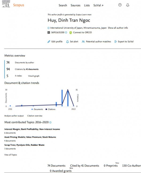 Thông tin xuất bản của Đinh Trần Ngọc Huy trên tạp chí thuộc danh mục Scopus cho thấy người này có 130 đồng tác giả |