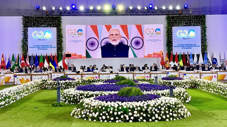 Thủ tướng Ấn Độ Narendra Modi phát biểu tại Hội nghị Bộ trưởng Tài chính và Thống đốc Ngân hàng trung ương G-20 hồi tuần trước (ANI)Phát biểu trước thềm Hội nghị, Ngoại trưởng Ấn Độ Jaishankar nói: “Hiện tại, các quốc gia G-20 đang chiếm tới 85% GDP của thế giới, 65% dân số thế giới và 75% kim ngạch trao đổi thương mại của thế giới. Nhưng tầm quan trọng của nó còn lớn hơn thế rất nhiều. Thực tế ở thời điểm này, G-20 đã trở thành một diễn đàn hàng đầu để xác định hướng đi mà thế giới nên đi theo. Đó là bởi trách nhiệm và công việc của G-20 là nhìn vào những thách thức đối với phát triển kinh tế, với tăng trưởng, để tìm ra giải pháp; tìm ra những lĩnh vực mới đang nảy sinh và đang thách thức thế giới, để giải quyết chúng. Cuộc họp định kỳ này, kể từ khi Ấn Độ tham gia vào năm 2008 đang ngày càng trở thành một diễn đàn quan trọng”.