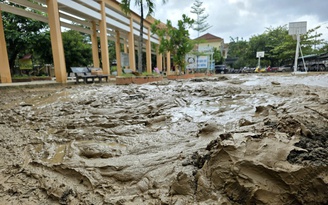 Sân Trường THCS Trịnh Phong ngập trong bùn sau lũ, hiện vẫn đang thiếu nhân lực để dọn dẹp
