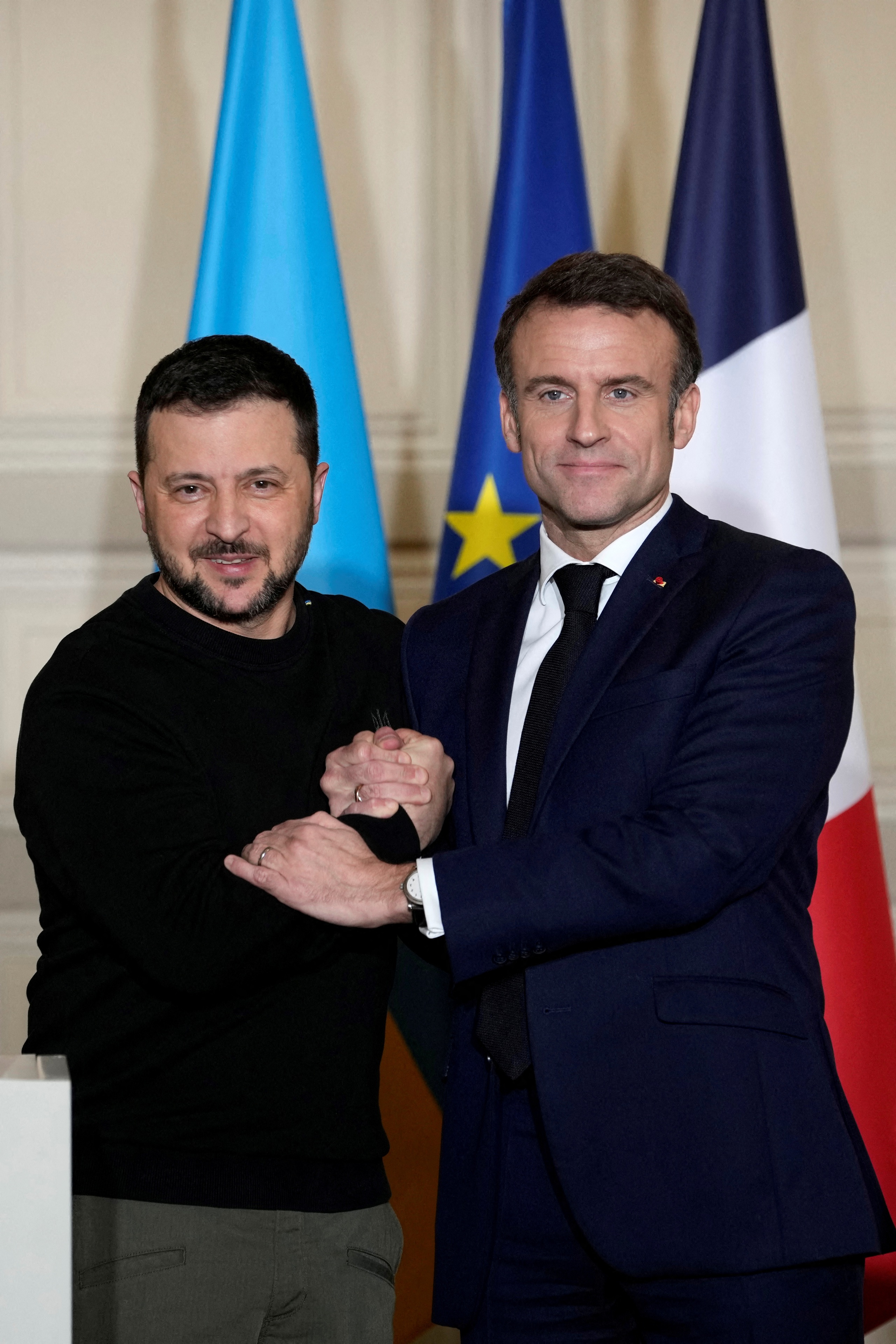 Tổng thống Pháp Emmanuel Macron (phải) và Tổng thống Ukraine Volodymyr Zelensky tại Paris hồi tháng 2.2024