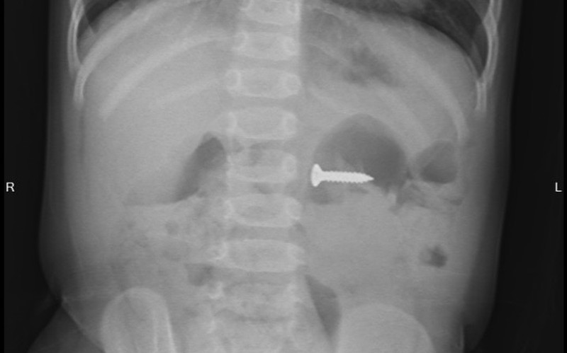 Khoa Cấp cứu, Bệnh viện Sản Nhi tỉnh Phú Thọ tiếp nhận bé N.P.C., 2 tuổi, đến khám do gia đình nghi ngờ bé nuốt phải 1 chiếc đinh vít trước đó.