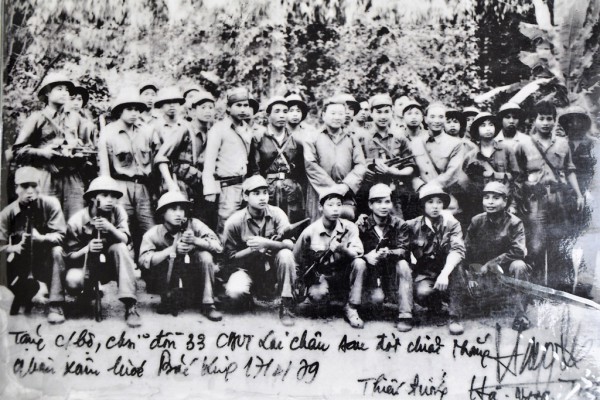 Thiếu tướng Hà Ngọc Tiếu, Phó tư lệnh CANDVT (thứ 6 từ trái qua, hàng đứng trước), chụp hình lưu niệm với bộ đội đồn Ma Lù Thàng sau trận 17.2.1979 và bút tích của ông