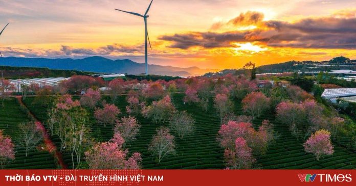 Sắc hồng mai anh đào đang vào độ nở rộ hòa quyện cùng những luống trà trải dài, tạo nên bức tranh xuân đặc trưng của cao nguyên.
