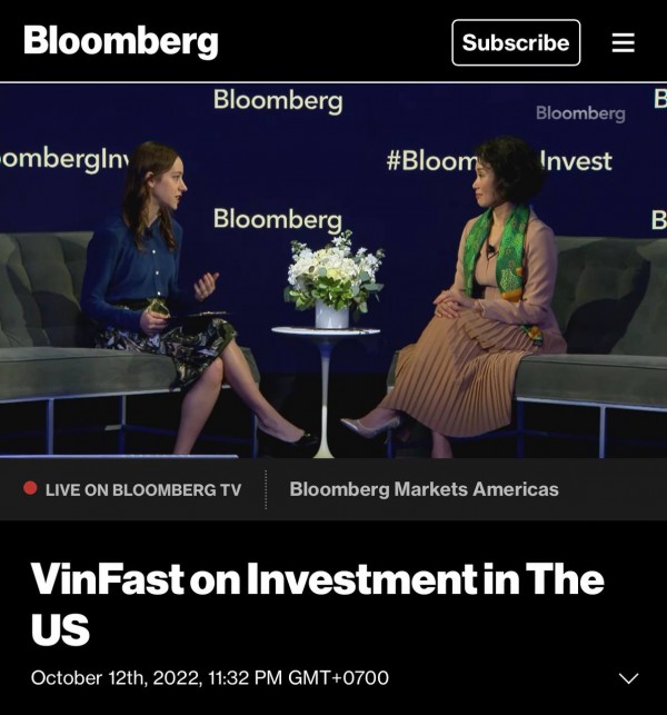 Hội nghị đầu tư toàn cầu (Bloomberg Invest) do Bloomberg tổ chức vào 12-13/10, quy tụ giới đầu tư tài chính, kinh doanh trên khắp thế giới. Tại sự kiện, bà Lê Thị Thu Thuỷ – Phó Chủ tịch Vingroup kiêm TGĐ VinFast toàn cầu đã có cuộc trao đổi với nhà báo Lauren Kiel trong phiên “Spotlight Conversation” về lí do VinFast quyết định đầu tư vào thị trường Mỹ và chiến lược tiếp thị độc đáo.