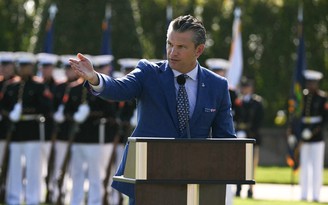 Bộ trưởng Quốc phòng Mỹ Pete Hegseth phát biểu tại Lầu Năm Góc ngày 19.9 ẢNH: AFP