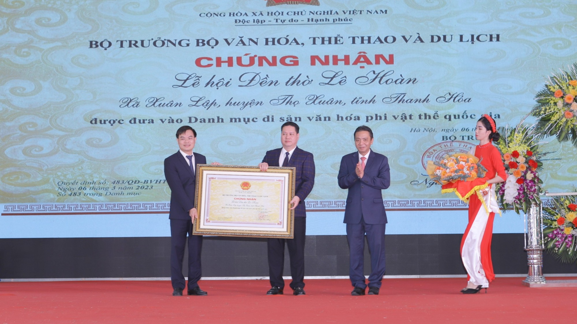 Đại diện Bộ VH-TT-DL trao giấy chứng nhận Lễ hội đền thờ Lê Hoàn là Di sản văn hóa phi vật thể quốc gia