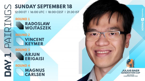 Generation Cup cờ vua diễn ra từ ngày 19 – 26.9 theo hình thức đấu trực tuyến với sự góp mặt của 16 kỳ thủ, trong đó có những gương mặt nổi bật như đương kim số 1 thế giới – vua cờ Carlsen, Anish Giri (hạng 7 thế giới), Levon Aronian (8 thế giới)… Lê Quang Liêm (hạng 20 thế giới) dự giải nhờ đang xếp hạng tư trên bảng xếp hạng của Grand Chess Tour mà Generation Cup là giải đấu trực thuộc.