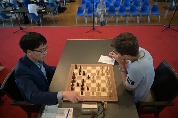 Lê Quang Liêm (phải) đạt mục tiêu cầm hòa kỳ thủ Nga để vô địch Festival cờ vua Biel 2022 |