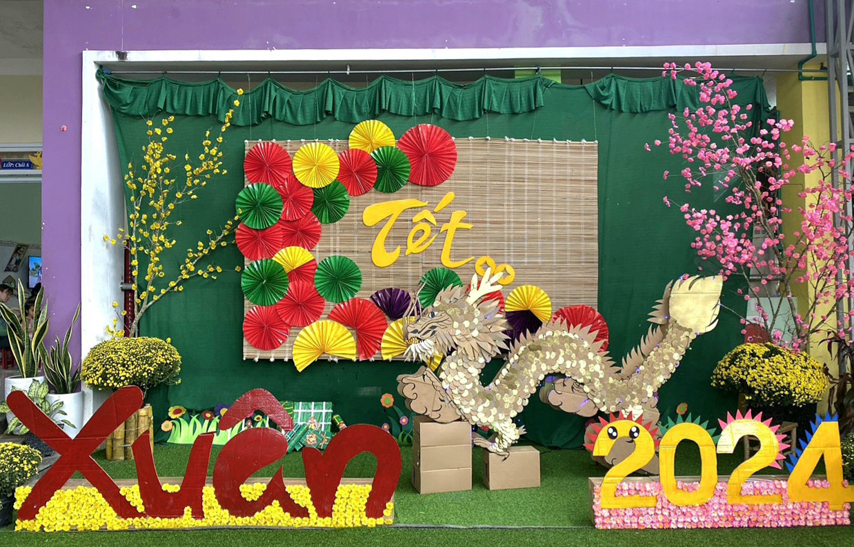 Mới đây, trang Facebook của Trường mầm non Họa Mi (ở TT.Di Lăng, H.Sơn Hà, Quảng Ngãi) đăng tải hình ảnh các giáo viên mầm non đang trang trí tiểu cảnh, làm linh vật đón Tết Nguyên đán Giáp Thìn 2024. Trong đó, hình ảnh linh vật rồng được làm từ bìa carton rất đẹp mắt, thu hút nhiều người vào bình luận khen ngợi.
