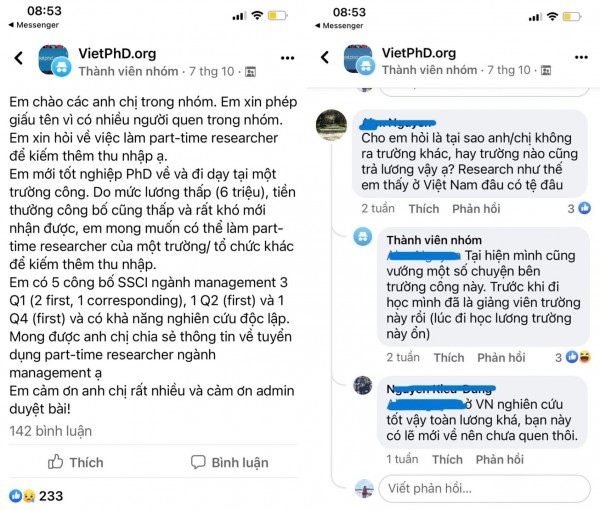 Được biết, đây là giảng viên của một trường ĐH công lập ở khu vực Đồng bằng sông Cửu Long, mới đi học tiến sĩ ở nước ngoài về, do lương quá thấp nên đã vào một trang fanpage của những người làm nghiên cứu khoa học, làm tiến sĩ (VietPhD) để chia sẻ.